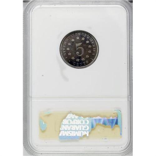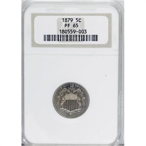 <B>1879 5C PR65 NGC.</B></I> Solidly struck and well preserved, with reflective fields and a rich layer of olive and rose patina across both sides. A planchet flaw resides between OF and AMERICA on the upper reverse, crossing through the outer left foot of A. Post-striking distractions are absent. <BR><I>From The Vanek Collection.</B></I><BR><BR><b>Shipping:</b> Coins & Currency (<a target="_blank" href="http://www.heritageauctions.com/common/shipping.php">view shipping information</a>)