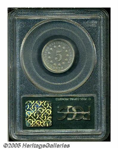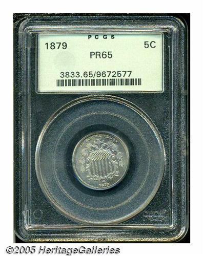 <B>1879<5C> PR65 PCGS.</B></I> This looks like the triple punched proof variety, Breen-2512, and as such is rare. Moderate gray-golden toning graces both sides and there is just the slightest flyspecking in evidence. Other than minor incompleteness on the E in STATES, and the S in CENTS, and scattered tiny planchet flaws (as struck) on each side, the coin seems very clean and attractive, and essentially free of post-strike defects.<BR><I>From The Western Hills Collection.</B></I>