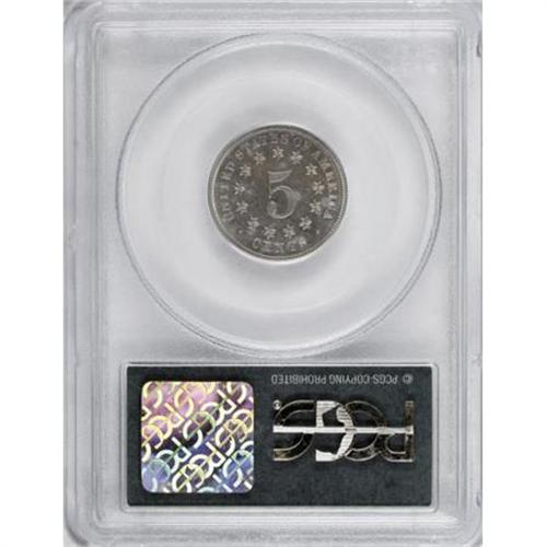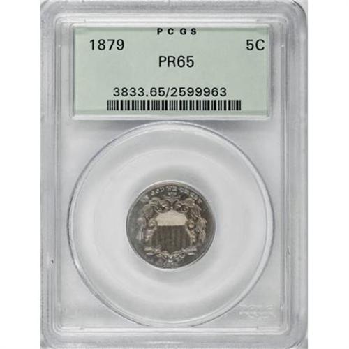 <B>1879 5C PR65 PCGS.</B></I> Pastel pink, blue, and canary-yellow shadings grace each side of this lovely Gem proof. Decisively struck with strong mirrors and impressive visual appeal for this popular issue.<BR><BR><B>Coin Engraver:</B> James B. Longacre<BR><BR><b>Shipping:</b> Coins & Currency (<a target="_blank" href="http://www.heritageauctions.com/common/shipping.php">view shipping information</a>)