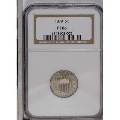 <B>1879<5C> PR66 NGC.</B></I> Traces of olive and rose patina appear on the fields, which have moderate to high reflectivity. A sharply detailed specimen with great eye appeal.