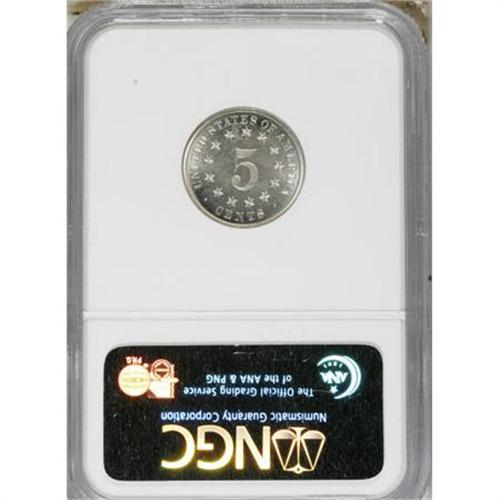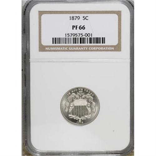 <B>1879 5C PR66 NGC.</B></I> Decisively struck with gleaming fields that offer distinct contrast with the obverse devices. Whispers of haze visit seemingly immaculate surfaces. NGC has graded just 11 finer pieces (1/08).<BR><BR><B>Coin Engraver:</B> James B. Longacre<BR><BR><b>Shipping:</b> Coins & Currency (<a target="_blank" href="http://www.heritageauctions.com/common/shipping.php">view shipping information</a>)