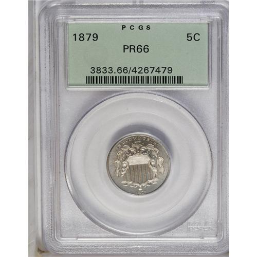<B>1879<5C> PR66 PCGS.</B></I> A gorgeously preserved premium Gem with wispy rose and lemon-gold patina. The mild cameo contrast between devices and field is not mentioned on the older green label insert. A low mintage date.