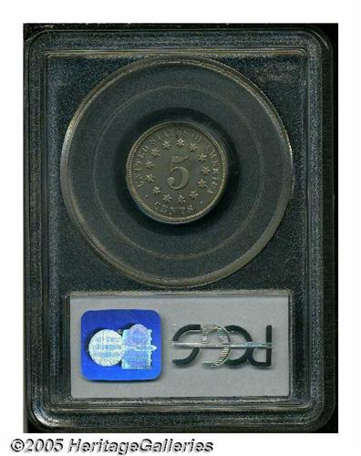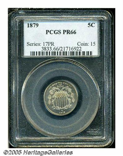 <B>1879<5C> PR66 PCGS.</B></I> Breen-2512. Triple-punched date. Sharply struck with splendid green-gold coloration and sparkling, seemingly pristine proof surfaces. A bright, highly reflective, lovely premium Gem.<BR><I>From The Western Hills Collection.</B></I>
