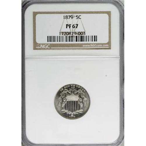 <B>1879/8 5C PR67 NGC.</B></I> Breen-2514, "Very Scarce." An overdate variety which is listed both in Breen and in the <I>Guide Book</B></I>. This Superb Gem example is sharply struck and seemingly pristine, with untoned surfaces that exhibit flashy reflectivity in the fields. <BR><BR><b>Shipping:</b> Coins & Currency (<a target="_blank" href="http://www.heritageauctions.com/common/shipping.php">view shipping information</a>)