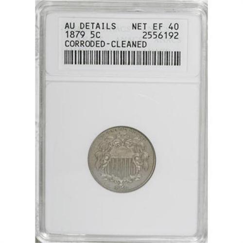 <B>1879 5C --Cleaned, Corroded--ANACS. AU Details, Net XF40.</B></I> NGC Census: (0/52). PCGS Population (2/83). Mintage: 25,900. Numismedia Wsl. Price for NGC/PCGS coin in XF40: $615. (#3808)<BR><BR><B>Coin Engraver:</B> James B. Longacre<BR><BR><b>Shipping:</b> Coins & Currency (<a target="_blank" href="http://www.heritageauctions.com/common/shipping.php">view shipping information</a>)