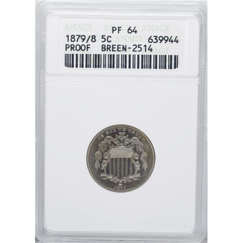 <B>1879/8 5C PR64 ANACS.</B></I> Breen-2514. Choice and boldly impressed with distinctive olive-gold patina over the fields. Light hairlines appear on the obverse, which has a mild degree of cameo contrast. The overdate is visible under magnification.<BR><BR><b>Shipping:</b> Coins & Currency (<a target="_blank" href="http://www.heritageauctions.com/common/shipping.php">view shipping information</a>)