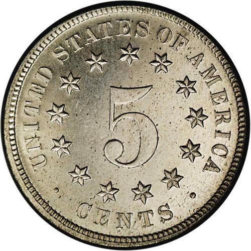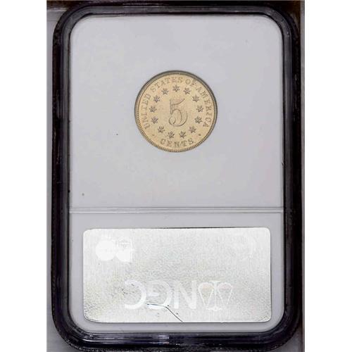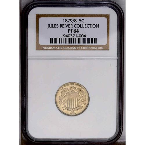<B>1879/8<5C> PR64 NGC.</B></I> Pleasing pale golden toning. The devices are sharp and frosty and the fields are nicely reflective, having a texture that is intermediate between satiny and mirrorlike as is characteristic of many and perhaps most proof Shield nickels of the era. A few tiny flecks and spots are all that keep this beauty out of the PR65 category. Walter Breen classifies the variety as very scarce, and notes that it "forms a small minority of proofs." Our experience suggests that this overdate is actually the more available Proof variety of the year and is a wonderful candidate for the type collector.