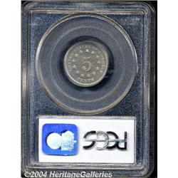 <B>1879/8<5C> PR64 PCGS.</B></I> In the history of proof American coinage, it is highly unusual for the mint to rehub the date from the previous year to a new one. This is one of the more famous examples of this oddity. This specimen is bright, with above average reflectivity for the hardness of the nickel alloy. Toning spots are scattered across the obverse and reverse. An attractive rarity. <BR><BR><B>Important notice:</B> Heritage usually auctions material at the rate of 200-250 lots per hour. On some occasions eBay Live bid software or the Internet may not be able to keep up with the pace of the auction. We recommend placing a realistic absentee bid now as insurance to avoid disappointment. Occasionally the auctioneer may eliminate or reject an eBay Live bid, and the auctioneer may also reopen a lot after the close of the eBay live bidding (usually because we missed an audience bid), and may reject your bid even if it shows you as the winning bidder. By bidding via eBay Live, you agree that Heritage may award the lot to another bidder at its sole discretion under the circumstances described above or any other reasonable circumstances. Since eBay bids are not shown to us until we open the lot on the floor, we treat those bids just like floor bids. In most cases the floor responds before the eBay bid is presented to us, due to Internet lag time, so for consistency we have made it a policy that floor bids are always considered first over tie eBay live bids. Also please note that all Heritage lots purchased through eBay Live carry a 20% Buyer's Premium. Please make sure you read the Terms and Conditions before you bid.