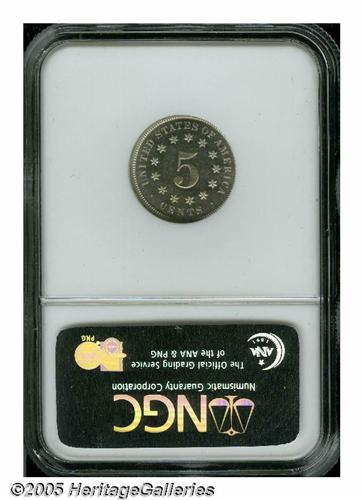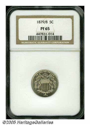 <B>1879/8<5C> PR65 NGC.</B></I> In the history of proof American coinage, it is highly unusual for the Mint to rehub the date from the previous year to a new one. This is one of the more famous examples of this oddity. This specimen displays bright, semi-reflective fields which offer a mild contrast against the motifs, especially on the obverse. Virtually untoned, sharply struck, and devoid of significant marks.