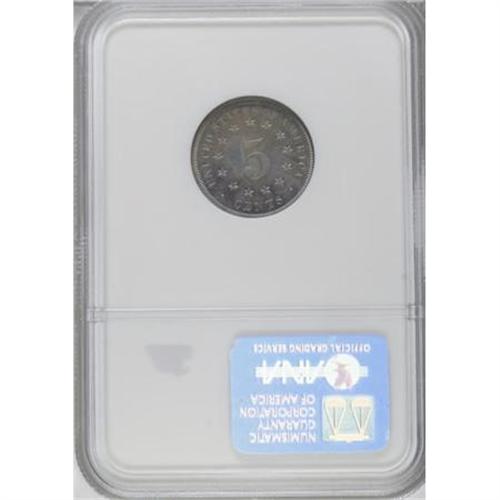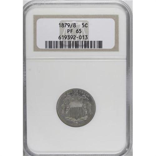 <B>1879/8 5C PR65 NGC.</B></I> Breen-2514. An attractive example of this <I>Guide Book</B></I> overdate, an unusual error for proof coinage. The surfaces of this Gem gleam beneath hazy green-gold and lavender patina.<BR><BR><B>Coin Engraver:</B> James B. Longacre<BR><BR><b>Shipping:</b> Coins & Currency (<a target="_blank" href="http://www.heritageauctions.com/common/shipping.php">view shipping information</a>)