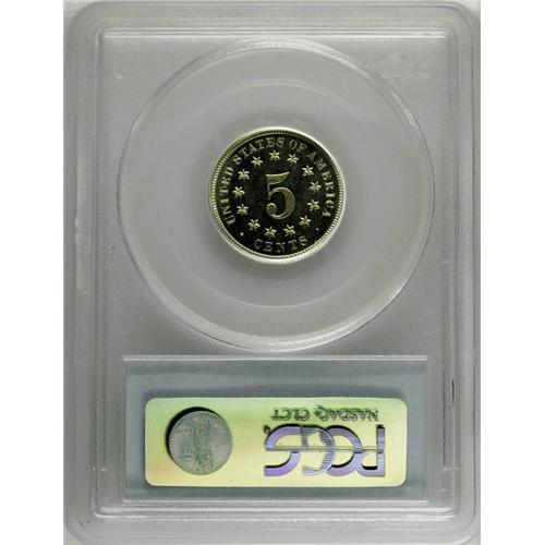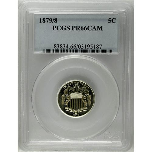 <B>1879/8<5C> PR66 Cameo PCGS.</B></I> Lavender and lilac toning covers the mirrored fields and the frosty devices show a charming cameo effect. Traces of the 8 beneath the 9 appear under magnification.<BR><I>From The Mulholland Collection.</B></I>