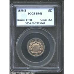 <TABLE cellSpacing=0 cellPadding=0 width="100%" bgColor=#000000 border=0><TBODY><TR><TD width="100%"><TABLE cellSpacing=1 cellPadding=3 width="100%" border=0><TBODY><TR><TD width="100%" bgColor=#79735c><FONT face=arial color=#ffffff size=3><B>Description</B> </FONT></TD></TR><TR><TD width="100%" bgColor=#ffffff><FONT face=arial size=2><B>1879/8 5C PR66 PCGS.</B></I> A needle-sharp Gem with splendid preservation and attractively variegated pearl-gray and lavender patina. A strong candidate for an advanced proof type set. </FONT></TD></TR></TBODY></TABLE></TD></TR></TBODY></TABLE><BR><A name=PricesRealized></A><TABLE cellSpacing=0 cellPadding=0 width="100%" bgColor=#000000 border=0><TBODY><TR><TD width="100%"><TABLE cellSpacing=1 cellPadding=3 width="100%" border=0><TBODY><TR><TD width="100%" bgColor=#79735c><A name=PR><FONT face=arial color=#ffffff size=3><B>Previous Prices from Heritage Auctions</B> </FONT></A></TD></TR><TR><TD bgColor=#f6f6ed><TABLE cellSpacing=0 cellPadding=0 width="100%" border=1><TBODY><TR><TD align=middle width="33%"><B>Date</B></TD><TD align=middle width="33%"><B>Service</B></TD><TD align=middle width="33%"><B>Price</B></TD></TR><TR bgColor=whitesmoke><TD width="33%"><B>11/01/1996</B></TD><TD width="33%">PCGS</TD><TD width="33%">$715.00</TD></TR><TR bgColor=whitesmoke><TD width="33%"><B>12/01/1997</B></TD><TD width="33%">PCGS</TD><TD width="33%">$853.00</TD></TR><TR bgColor=whitesmoke><TD width="33%"><B>09/01/1997</B></TD><TD width="33%">PCGS</TD><TD width="33%">$852.00</TD></TR><TR bgColor=whitesmoke><TD width="33%"><B>11/01/1999</B></TD><TD width="33%">PCGS</TD><TD width="33%">$863.00</TD></TR><TR bgColor=whitesmoke><TD width="33%"><B>11/01/1998</B></TD><TD width="33%">PCGS</TD><TD width="33%">$747.00</TD></TR><TR bgColor=whitesmoke><TD width="33%"><B>01/05/1994</B></TD><TD width="33%">PCGS</TD><TD width="33%">$1,155.00</TD></TR><TR bgColor=whitesmoke><TD width="33%"><B>04/23/1999</B></TD><TD width="33%">PCGS</TD><TD width="33%">$920.00</TD></TR><TR bgColor=whitesmoke><TD width="33%"><B>10/02/2000</B></TD><TD width="33%">NGC</TD><TD width="33%">$977.00</TD></TR><TR bgColor=whitesmoke><TD width="33%"><B>02/23/2002</B></TD><TD width="33%">NGC</TD><TD width="33%">$632.50</TD></TR><TR bgColor=whitesmoke><TD width="33%"><B>03/01/1999</B></TD><TD width="33%">NGC</TD><TD width="33%">$805.00</TD></TR><TR bgColor=whitesmoke><TD width="33%"><B>11/23/2002</B></TD><TD width="33%">PCGS</TD><TD width="33%">$1,380.00</TD></TR><TR bgColor=whitesmoke><TD width="33%"><B>10/06/2001</B></TD><TD width="33%">PCGS</TD><TD width="33%">$862.50</TD></TR><TR bgColor=whitesmoke><TD width="33%"><B>11/15/2001</B></TD><TD width="33%">ANACS</TD><TD width="33%">$603.75</TD></TR></TBODY></TABLE></TD></TR><TR><TD bgColor=#ffffff><FONT face=arial size=1 ?>PLEASE NOTE: All prices realized reflect the final hammer price PLUS the buyer's premium in auctions that charge a buyer's premium. Each item has a notation at the top of the listing indicating whether that lot included a buyer's premium. Example: A item that sells with a final hammer price of $100 and a 20% buyer's premium will display with a price realized of $120. All information listed is intended to be as accurate as possible, but errors are possible. Please use this guide carefully and inform us of any inaccuracies. </FONT></TD></TR></TBODY></TABLE></TD></TR></TBODY></TABLE><BR><TABLE cellSpacing=0 cellPadding=0 width="100%" bgColor=#000000 border=0><TBODY><TR><TD width="100%"><TABLE cellSpacing=1 cellPadding=3 width="100%" border=0><TBODY><TR><TD width="100%" bgColor=#79735c colSpan=6><FONT face=arial color=#ffffff size=3><B>Price Guide*</B> </FONT></TD></TR><TR bgColor=#f6f6ed><TD align=middle><B>Grade</B> </TD><TD align=middle><B>Coin World<BR>(Trends)</B> </TD><TD align=middle><B>Numismedia<BR>Retail</B> </TD><TD align=middle><B>Numismedia<BR>Wholesale</B> </TD><TD align=middle><B>Coin<BR>Universe</B> </TD><TD align=middle><B>Heritage<BR>Value Index</B> </TD></TR><TR bgColor=#ffffff><TD align=middle>65</TD><TD align=right>---</TD><TD align=right>$910.00</TD><TD align=right>$725.00</TD><TD align=right>$910.00</TD><TD align=right>$624.00</TD></TR><TR style="FONT-WEIGHT: bold" bgColor=#cccfdd><TD align=middle>66</TD><TD align=right>---</TD><TD align=right>---</TD><TD align=right>$850.00</TD><TD align=right>$1,150.00</TD><TD align=right>$1,092.50</TD></TR><TR bgColor=#ffffff><TD align=middle>67</TD><TD align=right>---</TD><TD align=right>---</TD><TD align=right>$1,775.00</TD><TD align=right>$3,250.00</TD><TD align=right>$2,112.50</TD></TR><TR bgColor=#ffffff><TD colSpan=6><FONT size=1>*All information listed is intended to be as accurate as possible, but errors are possible. No item may be returned or refused based on this information which is provided as a service to our customers. You should contact each pricing source directly to determine the accuracy of this information. </FONT></TD></TR></TBODY></TABLE></TD></TR></TBODY></TABLE><BR><TABLE cellSpacing=0 cellPadding=0 width="100%" bgColor=#000000 border=0><TBODY><TR><TD width="100%"><TABLE cellSpacing=1 cellPadding=3 width="100%" border=0><TBODY><TR><TD width="100%" bgColor=#79735c><FONT face=arial color=#ffffff size=3><B>Population Guide</B> </FONT></TD></TR><TR bgColor=#ffffff><TD align=middle><!-- Begin Output of Population Grid--><TABLE cellSpacing=0 cellPadding=0 width="100%" border=0><TBODY><TR><TD vAlign=center><TABLE cellSpacing=0 width="100%" border=1 cellsadding="3"><TBODY><TR><TD vAlign=center><TABLE cellSpacing=0 cellPadding=3 width="100%" border=1><TBODY><TR><TD vAlign=center align=middle bgColor=#f0f1e8 colSpan=2 <CENTER><FONT face=Arial size=2><B>PCGS Pop </B></FONT><CENTER></CENTER></TD><TD vAlign=center align=middle bgColor=#f0f1e8 colSpan=2><CENTER><FONT face=Arial size=2><B>NGC Pop</B></CENTER></FONT></TD></TR><TR><TD vAlign=center><FONT face=Arial size=2>(66)</FONT> </TD><TD vAlign=center align=right><FONT face=Arial size=2>115</FONT> </TD><TD vAlign=center><FONT face