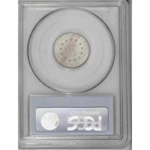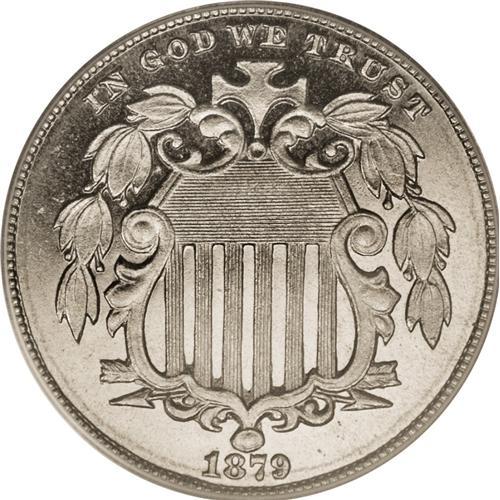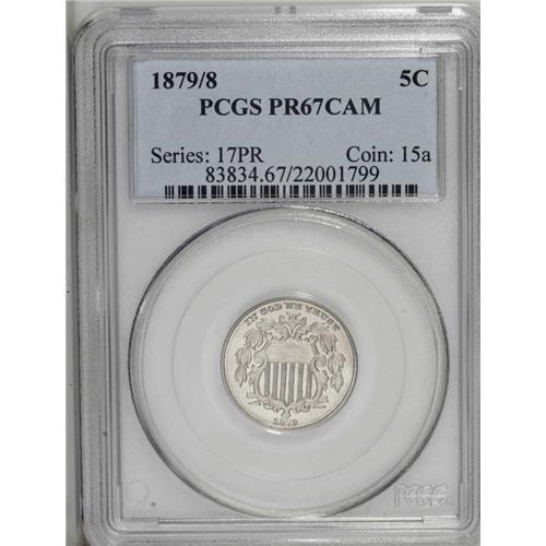 <B>1879/8<5C> PR67 Cameo PCGS.</B></I> This Superb cameo proof is a borderline deep cameo example with exceptional contrast between the deeply mirrored fields and fully lustrous devices. Both sides are brilliant light gray with subliminal gold accents. This overdate variety is only known in proof quality, and appears to be more plentiful than normal date proofs. Tied for the finest cameo proof of this issue certified by PCGS, although a few higher grade non-cameo examples have been graded. Population: 7 in 67 Cameo, 0 finer (8/06).<BR><I>From The Troy Wiseman Collection.</B></I>