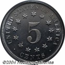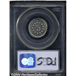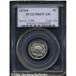 <B>1879/8<5C> PR67 Cameo PCGS.</B></I> A mostly brilliant example of this popular overdate Nickel, one of only two overdates struck in the 19th century in proof format, the other being the 1887/6 Three Cent Nickel. The obverse is bright white, while the reverse shows just the slightest bit of golden patina. The devices are nicely frosted and present strong contrast against the illimitable depth of reflectivity in the fields. Population: 8 in 67, none finer at either service (6/04).<BR><I>From The Del Rio Collection, Part Two.</B></I> <BR><BR><B>Important notice:</B> Heritage usually auctions material at the rate of 200-250 lots per hour. On some occasions eBay Live bid software or the Internet may not be able to keep up with the pace of the auction. We recommend placing a realistic absentee bid now as insurance to avoid disappointment. Occasionally the auctioneer may eliminate or reject an eBay Live bid, and the auctioneer may also reopen a lot after the close of the eBay live bidding (usually because we missed an audience bid), and may reject your bid even if it shows you as the winning bidder. By bidding via eBay Live, you agree that Heritage may award the lot to another bidder at its sole discretion under the circumstances described above or any other reasonable circumstances. Since eBay bids are not shown to us until we open the lot on the floor, we treat those bids just like floor bids. In most cases the floor responds before the eBay bid is presented to us, due to Internet lag time, so for consistency we have made it a policy that floor bids are always considered first over tie eBay live bids. Also please note that all Heritage lots purchased through eBay Live carry a 20% Buyer's Premium. Please make sure you read the Terms and Conditions before you bid. </span></font></tr></table></td></tr></table>
