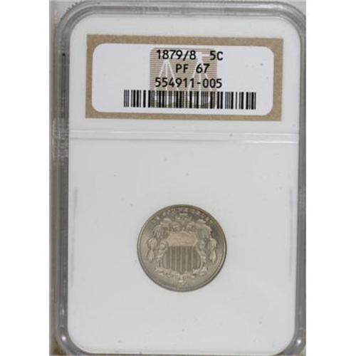 <B>1879/8 5C PR67 NGC.</B></I> Breen-2514. An attractive and beautifully preserved Superb Gem representative of this <I>Guide Book</B></I> overdate, noteworthy as the only proof overdate for the series and the denomination. Delicate peach, gold, and sky-blue tints grace the delightfully lustrous surfaces.<BR><BR><B>Coin Engraver:</B> James B. Longacre<BR><BR><b>Shipping:</b> Coins & Currency (<a target="_blank" href="http://www.heritageauctions.com/common/shipping.php">view shipping information</a>)