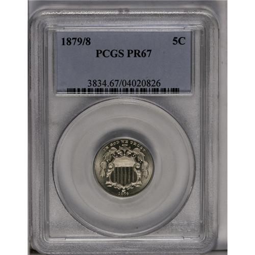 <B>1879/8<5C> PR67 PCGS.</B></I> Sparkling surfaces that exhibit a fully brilliant, untoned appearance. Like the 1887/6 proof three cent nickel, this overdate variety is really not any scarcer than the normal date. Superb quality throughout. Population: 22 in 67, 7 finer (6/06).