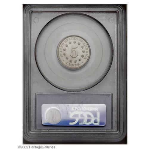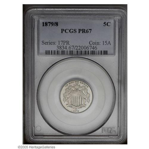 <B>1879/8<5C> PR67 PCGS.</B></I> This is an absolutely delightful Shield nickel for both type and date. Fully struck shield and stars with unblemished fields make this a coin not to be missed. Only 8 coins grade higher so you had best pay attention to this one.