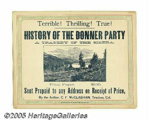 <B>1879 Advertising Sign for Donner Party Book</B></I> "Terrible! Thrilling! True!" exclaims this super cardstock advertising sign. All of us who know a little about the story of this famous group of people would probably agree with these adjectives. This book, <I>History of the Donner Party, A Tragedy of the Sierra,</B></I> by C. F. McGlashan, was first published in 1879, taken from survivors' eyewitness accounts and is still known to be one of the finest reference works available on this tragic incident. The author is advertising the book for $1.00, sent prepaid to any address. It is 14" x 11" in size with a red and green decorative border surrounding the text and a fine engraving of the Sierras, printed by H. S. Crocker & Co. of Sacramento. Fine condition. Lot:253