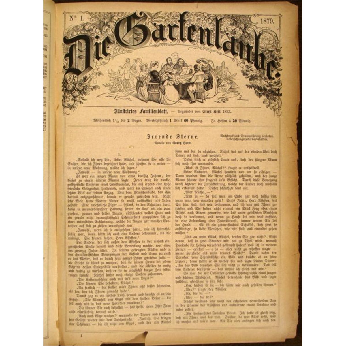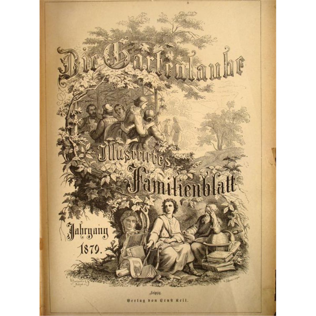 THIS IS A 1879 BOUND EDITIONS OF "DIE GARTENLAUBE", THAT WAS PUBLISHED DAILY IN LEIPZIG, GERMANY. IT IS HARD COVER BOUND, IT COVERED THE ENTIRE YEAR OF 1879, AND IT IS WRITTEN IN GERMAN. THE BOOK CONTAINS BEAUTIFUL ART DRAWINGS. IT IS IN GOOD CONDITION, YET THE SPINE IS SEPARATED FROM THE COVER. THE BOOKS OVERALL SIZE IS 9 1/2" X 12 1/2" X 2". * *