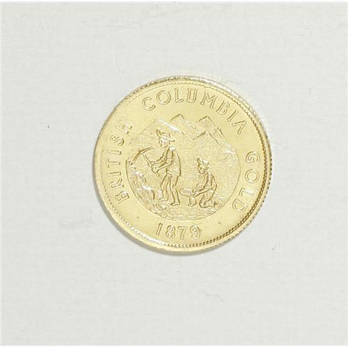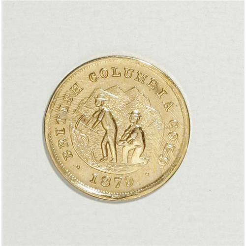 <B>1879 British Columbia, Canada Gold Charms.</B></I> Two different one dollar gold pieces from British Columbia, Canada. The obverse features two miners, and the reverse features the shield of British Columbia. At first glance the two pieces appear identical, but they are completely different. The date 1879 does not appear on the list of dates seen or reported to Burnie at the time he wrote the descriptions in his reference catalog. A great addition to a Canadian collection, with a market value of about $175-$275.<BR><BR><b>Shipping:</b> Coin/Currency (<a target="_blank" href="http://www.heritageauctions.com/common/shipping.php">view shipping information</a>)