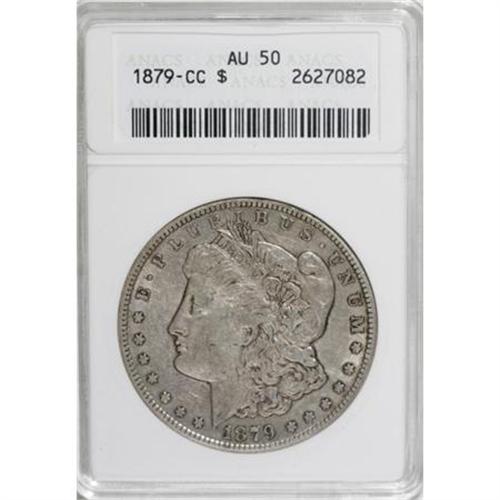 <B>1879-CC $1 AU50 ANACS.</B></I> Clear CC. Deep steel-gray and caramel-gold toning embraces this moderately circulated and undipped better date CC-mint dollar. Collectors in search of a problem-free example of this want list perennial need look no further.<BR><BR><b>Shipping:</b> Coins & Currency (<a target="_blank" href="http://www.heritageauctions.com/common/shipping.php">view shipping information</a>)