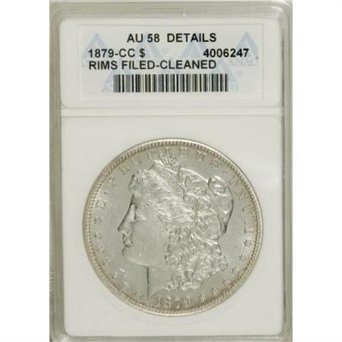1879-CC $1 --Rims Filed, Cleaned--AU58 ANACS. Close to Mint State in terms of wear, but this piece shows light rim filing and signs of cleaning that have left it overly shiny. A couple of abrasions are noted on the cheek, but this coin still has much attraction and would fit well into a Mint State set at an advantageous price.<BR><BR><B>Coin Engraver:</B> George T. Morgan<BR><BR><b>Shipping:</b> Coins & Currency (<a target="_blank" href="http://www.heritageauctions.com/common/shipping.php">view shipping information</a>)