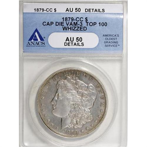 <B>1879-CC $1 Capped Die--Whizzed--ANACS.</B></I> <B>AU50 Details.</B></I> VAM-3. A Top 100 variety. NGC Census: (36/740). PCGS Population (24/1227). Numismedia Wsl. Price for NGC/PCGS coin in AU50: $1,350. (#7088)<BR><BR><B>Coin Engraver:</B> George T. Morgan<BR><BR><b>Shipping:</b> Coins & Currency (<a target="_blank" href="http://www.heritageauctions.com/common/shipping.php">view shipping information</a>)