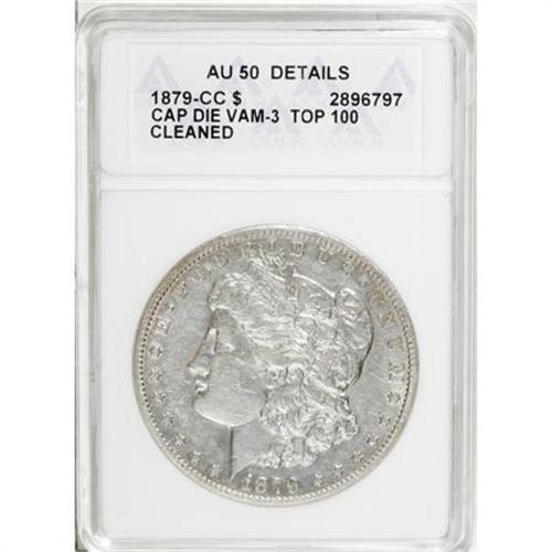 <B>1879-CC $1 Capped Die--Cleaned--ANACS. AU50 Details.</B></I> VAM-3. A Top 100 Variety. Luster outlines the legends and fills design recesses. This pearl-gray example is subdued from a dip, but the devices show only moderate wear. A faded V-shaped mark is noted near the M in UNUM. A popular CC-mint key.<BR><BR><B>Coin Engraver:</B> George T. Morgan<BR><BR><b>Shipping:</b> Coins & Currency (<a target="_blank" href="http://www.heritageauctions.com/common/shipping.php">view shipping information</a>)