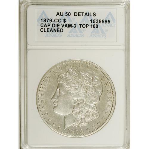 <B>1879-CC $1 Capped Die--Cleaned--ANACS. AU50 Details.</B></I> Vam-3, Top-100. NGC Census: (72/1356). PCGS Population (20/1163). Numismedia Wsl. Price for NGC/PCGS coin in AU50: $1,350. (#7088)<BR><BR><b>Shipping:</b> Coins & Currency (<a target="_blank" href="http://www.heritageauctions.com/common/shipping.php">view shipping information</a>)