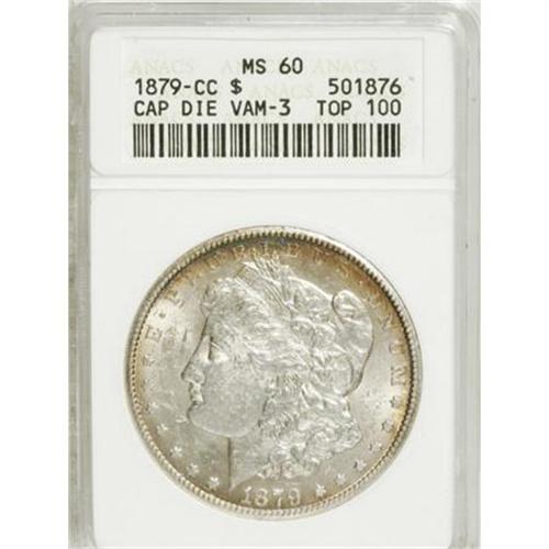 <B>1879-CC $1 Capped Die MS60 ANACS.</B></I> VAM-3, A Top 100 variety. The 1879-CC Capped Die, or Large CC Over Small CC variety. Whispers of reddish-tan and cobalt-blue concentrate at the margins of this MS60 coin. Soft luster resides on lightly abraded surfaces, and the design elements show fairly sharp definition.<BR><BR><B>Coin Engraver:</B> George T. Morgan<BR><BR><b>Shipping:</b> Coins & Currency (<a target="_blank" href="http://www.heritageauctions.com/common/shipping.php">view shipping information</a>)
