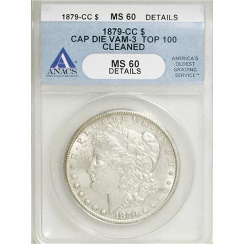 <B>1879-CC $1 Capped Die--Cleaned--ANACS. MS60 Details.</B></I> VAM-3. A Top 100 Variety. Careful rotation eventually locates a patch of faint hairlines near Liberty's chin, but this key date Carson City dollar has ample luster. The cheek has marks consistent with the MS60 level.<BR><BR><B>Coin Engraver:</B> George T. Morgan<BR><BR><b>Shipping:</b> Coins & Currency (<a target="_blank" href="http://www.heritageauctions.com/common/shipping.php">view shipping information</a>)