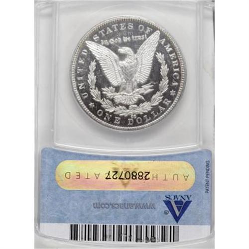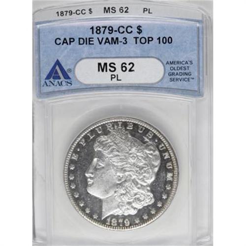 <B>1879-CC $1 Capped Die MS62 Prooflike ANACS.</B></I> VAM-3. A Top 100 Variety. This well mirrored example offers moderate mint frost over the devices. The surfaces are untoned, save for a thin ring of gold around the rims on each side. Numerous light to moderate abrasions, more so on the obverse than reverse, confirm the grade. As both a <Guide Book< and a Fey-Oxman <Top 100 Morgan Dollar Varieties< coin, the Capped Die issue in high grades appears well poised for future appreciation and enthusiasm on the part of the countless numbers of Morgan dollar collectors. Although it is less popular than the Perfect Mintmark variant, is it scarcer in high grades.<BR><BR><B>Coin Engraver:</B> George T. Morgan<BR><BR><b>Shipping:</b> Coins & Currency (<a target="_blank" href="http://www.heritageauctions.com/common/shipping.php">view shipping information</a>)