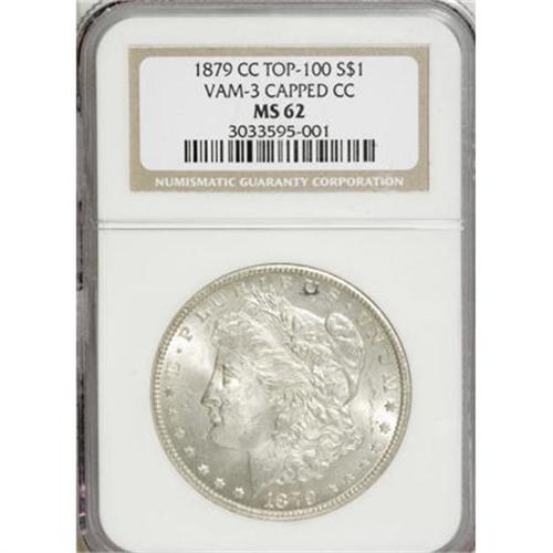 <B>1879-CC $1 Capped Die MS62 NGC.</B></I> VAM-3, A Top 100 variety. The 1879-CC Capped Die, also known as the Large CC Over Small CC variety, documents a poor attempt by a mint employee to efface a smaller mintmark before adding the larger CC mintmark to the die. This example is attractive for the assigned grade, displaying rich luster and minimal abrasions. <BR><BR><B>Coin Engraver:</B> George T. Morgan<BR><BR><b>Shipping:</b> Coins & Currency (<a target="_blank" href="http://www.heritageauctions.com/common/shipping.php">view shipping information</a>)