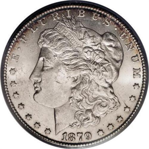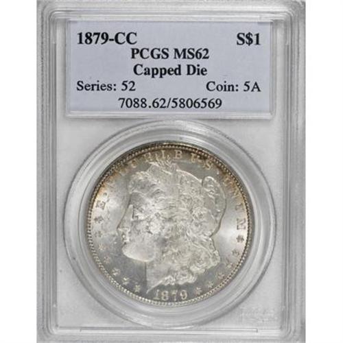 <B>1879-CC $1 Capped Die MS62 PCGS.</B></I> VAM-3. A Top 100 Variety. A classic example of the Capped Die VAM, with numerous minute die chips near the mintmark. The cream-gray fields and devices are bounded by honey-gold and ice-blue toning. The centers are slightly soft, but the remainder of the piece is sharply defined.<BR><BR><B>Coin Engraver:</B> George T. Morgan<BR><BR><b>Shipping:</b> Coins & Currency (<a target="_blank" href="http://www.heritageauctions.com/common/shipping.php">view shipping information</a>)