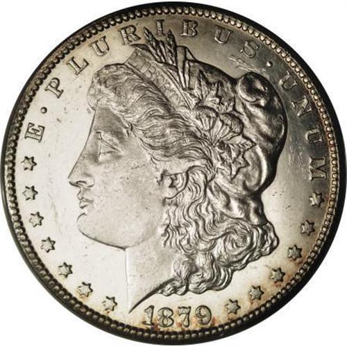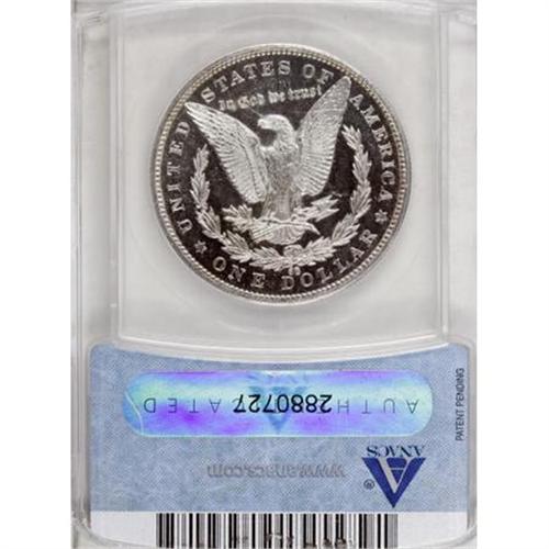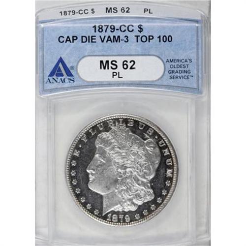 <B>1879-CC $1 Capped Die MS62 Prooflike ANACS.</B></I> VAM-3. A Top 100 Variety. This well mirrored example offers moderate mint frost over the devices. The surfaces are untoned, save for a thin ring of gold around the rims on each side. Numerous light to moderate abrasions, more so on the obverse than reverse, confirm the grade. As both a <Guide Book< and a Fey-Oxman <Top 100 Morgan Dollar Varieties< coin, the Capped Die issue in high grades appears well poised for future appreciation and enthusiasm on the part of the countless numbers of Morgan dollar collectors. Although it is less popular than the Perfect Mintmark variant, is it scarcer in high grades.<BR><BR><B>Coin Engraver:</B> George T. Morgan<BR><BR><b>Shipping:</b> Coins & Currency (<a target="_blank" href="http://www.heritageauctions.com/common/shipping.php">view shipping information</a>)