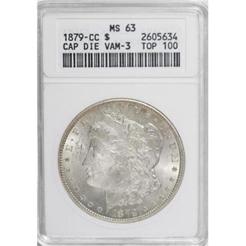 <B>1879-CC $1 Capped Die MS63 ANACS.</B></I> VAM-3. A Top 100 Variety. The curious "Capped Die" variety, actually a Medium over Small CC mintmark. The tiny die chips within the mintmark area repelled collectors until recent decades, when the cause of such things was better understood. A lustrous almond-gold representative with pleasing surfaces. The centers are typically struck and display faint roller marks, as made.<BR><BR><b>Shipping:</b> Coins & Currency (<a target="_blank" href="http://www.heritageauctions.com/common/shipping.php">view shipping information</a>)