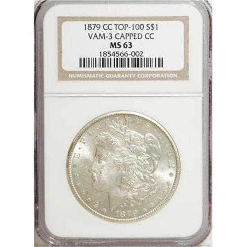 <B>1879-CC $1 Capped Die MS63 NGC.</B></I> VAM-3. A Top 100 Variety. This variety should probably be called the 1879-CC/CC, as its most notable feature is a medium mintmark over a small mintmark. A bit of weakness is visible on the hair over Liberty's ear, as often seen; the reverse detail is full. Highly lustrous with traces of golden-tan color more notable on the obverse than the reverse and a few surface marks well in line with the Choice grade.<BR><BR><B>Coin Engraver:</B> George T. Morgan<BR><BR><b>Shipping:</b> Coins & Currency (<a target="_blank" href="http://www.heritageauctions.com/common/shipping.php">view shipping information</a>\)
