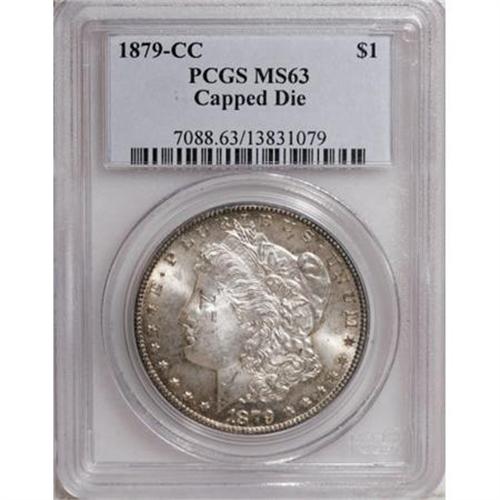 <B>1879-CC $1 Capped Die MS63 PCGS.</B></I> VAM-3. A Top 100 Variety. Golden-brown toning enriches the margins of this lustrous key date Carson City dollar. The fields are nicely preserved, and the portrait has only selected minor grazes. The centers are slightly soft, as usual for the "Capped Die" VAM.<BR><BR><B>Coin Engraver:</B> George T. Morgan<BR><BR><b>Shipping:</b> Coins & Currency (<a target="_blank" href="http://www.heritageauctions.com/common/shipping.php">view shipping information</a>)