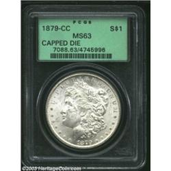 <TR><TD width="100%"><TABLE cellSpacing=1 cellPadding=3 width="100%" border=0><TBODY><TR><TD width="100%" bgColor=#79735c><FONT face=arial color=#ffffff size=3><B>Description</B> </FONT></TD></TR><TR><TD width="100%" bgColor=#ffffff><FONT face=arial size=2><B>1879-CC $1 Capped Die MS63 PCGS.</B></I> VAM-3. Top 100 Variety. Only in recent years has the true nature of the "Capped Die" become known. It is actually a large over small mintmark, but it was a variant that for many years was shunned by collectors in favor of coins with the so-called "Perfect" mintmark. However, the "Capped Die" coins are actually scarcer than the "Perfect Die" Dollars, especially in the higher grades of Uncirculated. This is an untoned example that has soft, frosted mint luster over each side. The surfaces show numerous small abrasions that account for the grade, but none that are especially troubling on an individual basis. </FONT></TD></TR></TBODY></TABLE></TD></TR></TBODY></TABLE><BR><A name=PricesRealized></A><TABLE cellSpacing=0 cellPadding=0 width="100%" bgColor=#000000 border=0><TBODY><TR><TD width="100%"><TABLE cellSpacing=1 cellPadding=3 width="100%" border=0><TBODY><TR><TD width="100%" bgColor=#79735c><A name=PR><FONT face=arial color=#ffffff size=3><B>Previous Prices from Heritage Auctions</B> </FONT></A></TD></TR><TR><TD bgColor=#f6f6ed><TABLE cellSpacing=0 cellPadding=0 width="100%" border=1><TBODY><TR><TD align=middle width="33%"><B>Date</B></TD><TD align=middle width="33%"><B>Service</B></TD><TD align=middle width="33%"><B>Price</B></TD></TR><TR bgColor=whitesmoke><TD width="33%"><B>11/23/2002</B></TD><TD width="33%">PCGS</TD><TD width="33%">$2,530.00</TD></TR><TR bgColor=whitesmoke><TD width="33%"><B>02/23/2002</B></TD><TD width="33%">PCGS</TD><TD width="33%">$2,530.00</TD></TR><TR bgColor=whitesmoke><TD width="33%"><B>08/08/2001</B></TD><TD width="33%">PCGS</TD><TD width="33%">$2,530.00</TD></TR><TR bgColor=whitesmoke><TD width="33%"><B>03/01/1999</B></TD><TD width="33%">PCGS</TD><TD width="33%">$2,760.00</TD></TR><TR bgColor=whitesmoke><TD width="33%"><B>01/06/1996</B></TD><TD width="33%">NGC</TD><TD width="33%">$1,666.50</TD></TR><TR bgColor=whitesmoke><TD width="33%"><B>01/01/1995</B></TD><TD width="33%">NGC</TD><TD width="33%">$3,080.00</TD></TR><TR bgColor=whitesmoke><TD width="33%"><B>01/01/1998</B></TD><TD width="33%">ANACS</TD><TD width="33%">$2,255.00</TD></TR></TBODY></TABLE></TD></TR><TR><TD bgColor=#ffffff><FONT face=arial size=1 ?>PLEASE NOTE: All prices realized reflect the final hammer price PLUS the buyer's premium in auctions that charge a buyer's premium. Each item has a notation at the top of the listing indicating whether that lot included a buyer's premium. Example: A item that sells with a final hammer price of $100 and a 20% buyer's premium will display with a price realized of $120. All information listed is intended to be as accurate as possible, but errors are possible. Please use this guide carefully and inform us of any inaccuracies. </FONT></TD></TR></TBODY></TABLE></TD></TR></TBODY></TABLE><BR><TABLE cellSpacing=0 cellPadding=0 width="100%" bgColor=#000000 border=0><TBODY><TR><TD width="100%"><TABLE cellSpacing=1 cellPadding=3 width="100%" border=0><TBODY><TR><TD width="100%" bgColor=#79735c colSpan=6><FONT face=arial color=#ffffff size=3><B>Price Guide*</B> </FONT></TD></TR><TR bgColor=#f6f6ed><TD align=middle><B>Grade</B> </TD><TD align=middle><B>Coin World<BR>(Trends)</B> </TD><TD align=middle><B>Numismedia<BR>Retail</B> </TD><TD align=middle><B>Numismedia<BR>Wholesale</B> </TD><TD align=middle><B>Coin<BR>Universe</B> </TD><TD align=middle><B>Heritage<BR>Value Index</B> </TD></TR><TR bgColor=#ffffff><TD align=middle>62</TD><TD align=right>$2,000.00</TD><TD align=right>---</TD><TD align=right>$1,875.00</TD><TD align=right>$2,150.00</TD><TD align=right>$1,641.00</TD></TR><TR style="FONT-WEIGHT: bold" bgColor=#cccfdd><TD align=middle>63</TD><TD align=right>$3,000.00</TD><TD align=right>---</TD><TD align=right>$2,525.00</TD><TD align=right>$3,500.00</TD><TD align=right>$2,294.00</TD></TR><TR bgColor=#ffffff><TD align=middle>64</TD><TD align=right>$5,000.00</TD><TD align=right>---</TD><TD align=right>$3,900.00</TD><TD align=right>$5,600.00</TD><TD align=right>$3,570.00</TD></TR><TR bgColor=#ffffff><TD colSpan=6><FONT size=1>*All information listed is intended to be as accurate as possible, but errors are possible. No item may be returned or refused based on this information which is provided as a service to our customers. You should contact each pricing source directly to determine the accuracy of this information. </FONT></TD></TR></TBODY></TABLE></TD></TR></TBODY></TABLE><BR><TABLE cellSpacing=0 cellPadding=0 width="100%" bgColor=#000000 border=0><TBODY><TR><TD width="100%"><TABLE cellSpacing=1 cellPadding=3 width="100%" border=0><TBODY><TR><TD width="100%" bgColor=#79735c><FONT face=arial color=#ffffff size=3><B>Population Guide</B> </FONT></TD></TR><TR bgColor=#ffffff><TD align=middle><!-- Begin Output of Population Grid--><TABLE cellSpacing=0 cellPadding=0 width="100%" border=0><TBODY><TR><TD vAlign=center><TABLE cellSpacing=0 width="100%" border=1 cellsadding="3"><TBODY><TR><TD vAlign=center><TABLE cellSpacing=0 cellPadding=3 width="100%" border=1><TBODY><TR><TD vAlign=center align=middle bgColor=#f0f1e8 colSpan=2 <CENTER><FONT face=Arial size=2><B>PCGS Pop </B></FONT><CENTER></CENTER></TD><TD vAlign=center align=middle bgColor=#f0f1e8 colSpan=2><CENTER><FONT face=Arial size=2><B>NGC Pop</B></CENTER></FONT></TD></TR><TR><TD vAlign=center><FONT face=Arial size=2>(63)</FONT> </TD><TD vAlign=center align=right><FONT face=Arial size=2>169</FONT> </TD><TD vAlign=center><FONT face=Arial size=2>(63)</FONT> </TD><TD vAlign=center align=right><FONT face=Arial size=2>117</FONT> </TD></TR><TR><TD vAlign=center><FONT face=Arial size=2>(>63)</FONT> </TD><TD vAlign=center align=right><FONT face=Arial size=2>176</FONT> </TD><TD vAlign=center><FONT face=Arial size=2>(>63)</FONT