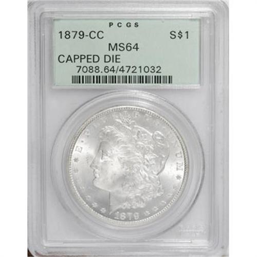 <B>1879-CC $1 Capped Die MS64 PCGS.</B></I> VAM-3. A Top 100 Variety. This variety illustrates die chipping around the "Medium CC" mint mark, resulting from mint personnel's attempt to tool away an underlying "Small CC." This so-called "Capped Die" is the scarcer of the two. Glowing luster exudes from silver-gray surfaces that are tinted with light tan on the reverse. Generally well struck on the design elements, and possessing just a few minor obverse marks. Housed in a green-label holder.<BR><BR><b>Shipping:</b> Coins & Currency (<a target="_blank" href="http://www.heritageauctions.com/common/shipping.php">view shipping information</a>)