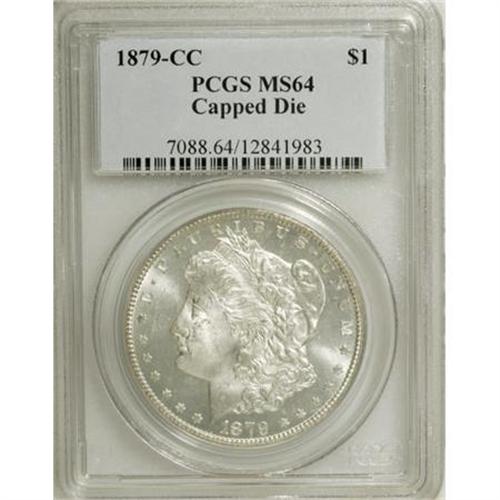 <B>1879-CC $1 Capped Die MS64 PCGS.</B></I> VAM-3. A Top 100 Variety. Remnants of the original small mintmark can be seen above the repunched larger mintmark. It seems that the Carson City Mint workman charged with entering mintmarks into new coin dies must have grabbed a punch intended for a smaller diameter coin. Realizing the mistake, the mintmark was tooled away and the larger punch was then used. This wonderful dollar has fully brilliant silver-white surfaces with reflective fields and frosty devices.<BR><I>From The Yoder Family Collection, Part One.</B></I><BR><BR><B>Coin Engraver:</B> George T. Morgan<BR><BR><b>Shipping:</b> Coins & Currency (<a target="_blank" href="http://www.heritageauctions.com/common/shipping.php">view shipping information</a>)