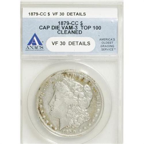 <B>1879-CC $1 Capped Die--Cleaned--ANACS. VF30 Details.</B></I> VAM-3. A Top-100 Variety. NGC Census: (17/853). PCGS Population (30/1361). Numismedia Wsl. Price for NGC/PCGS coin in VF30: $341. (#7088)<BR><BR><B>Coin Engraver:</B> George T. Morgan<BR><BR><b>Shipping:</b> Coins & Currency (<a target="_blank" href="http://www.heritageauctions.com/common/shipping.php">view shipping information</a>)