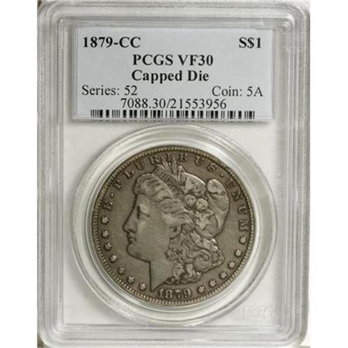<B>1879-CC $1 Capped Die VF30 PCGS.</B></I> PCGS Population (29/1358). NGC Census: (17/853). Numismedia Wsl. Price for NGC/PCGS coin in VF30: $341. (#7088)<BR><BR><B>Coin Engraver:</B> George T. Morgan<BR><BR><b>Shipping:</b> Coins & Currency (<a target="_blank" href="http://www.heritageauctions.com/common/shipping.php">view shipping information</a>)