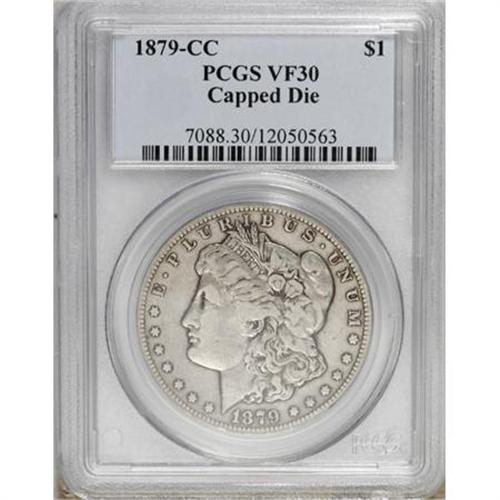 <B>1879-CC $1 Capped Die VF30 PCGS.</B></I> PCGS Population (32/1382). NGC Census: (17/888). Numismedia Wsl. Price for NGC/PCGS coin in VF30: $341. (#7088)<BR><BR><B>Coin Engraver:</B> George T. Morgan<BR><BR><b>Shipping:</b> Coins & Currency (<a target="_blank" href="http://www.heritageauctions.com/common/shipping.php">view shipping information</a>)