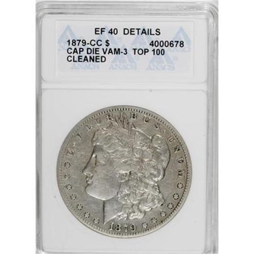 <B>1879-CC $1 Capped Die--Cleaned--ANACS. XF40 Details.</B></I> Vam-3 Top-100. NGC Census: (38/800). PCGS Population (43/1259). Numismedia Wsl. Price for NGC/PCGS coin in XF40: $540. (#7088)<BR><BR><B>Coin Engraver:</B> George T. Morgan<BR><BR><b>Shipping:</b> Coins & Currency (<a target="_blank" href="http://www.heritageauctions.com/common/shipping.php">view shipping information</a>)