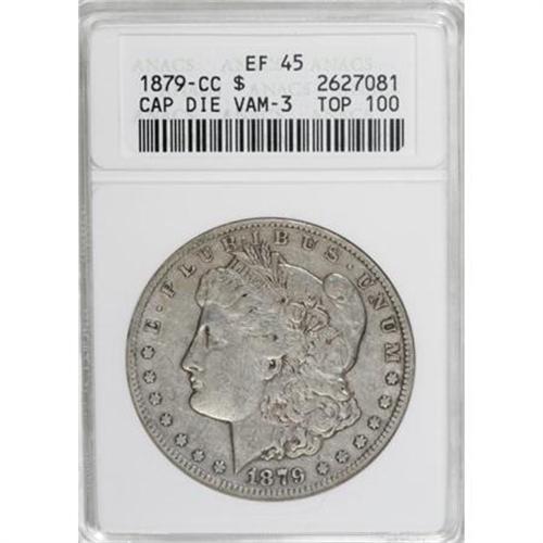 <B>1879-CC $1 Capped Die XF45 ANACS.</B></I> VAM-3. A Top 100 Variety. The well known VAM with tiny die chips around the mintmark. In this grade, the difference in appearance between the Normal and Capped mintmark varieties is minimal. A cream-gray example without any obtrusive marks. A die break fills the G in GOD.<BR><BR><b>Shipping:</b> Coins & Currency (<a target="_blank" href="http://www.heritageauctions.com/common/shipping.php">view shipping information</a>)