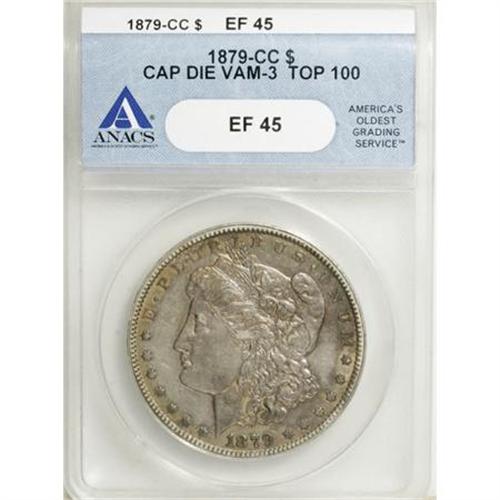 <B>1879-CC $1 Capped Die XF45 ANACS.</B></I> VAM-3. A Top 100 Variety. Medium gray surfaces, somewhat lighter on the reverse, with slight peripheral iridescence.<BR><BR><B>Coin Engraver:</B> George T. Morgan<BR><BR><b>Shipping:</b> Coins & Currency (<a target="_blank" href="http://www.heritageauctions.com/common/shipping.php">view shipping information</a>)