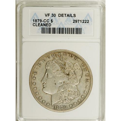 <B>1879-CC $1 --Cleaned--ANACS. VF30 Details.</B></I> NGC Census: (121/2439). PCGS Population (58/2297). Mintage: 756,000. Numismedia Wsl. Price for NGC/PCGS coin in VF30: $350. (#7086)<BR><BR><b>Shipping:</b> Coins & Currency (<a target="_blank" href="http://www.heritageauctions.com/common/shipping.php">view shipping information</a>)