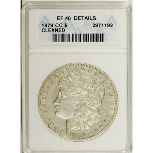 <B>1879-CC $1 --Cleaned--ANACS. XF40 Details.</B></I> NGC Census: (114/2198). PCGS Population (63/2180). Mintage: 756,000. Numismedia Wsl. Price for NGC/PCGS coin in XF40: $550. (#7086)<BR><BR><b>Shipping:</b> Coins & Currency (<a target="_blank" href="http://www.heritageauctions.com/common/shipping.php">view shipping information</a>)