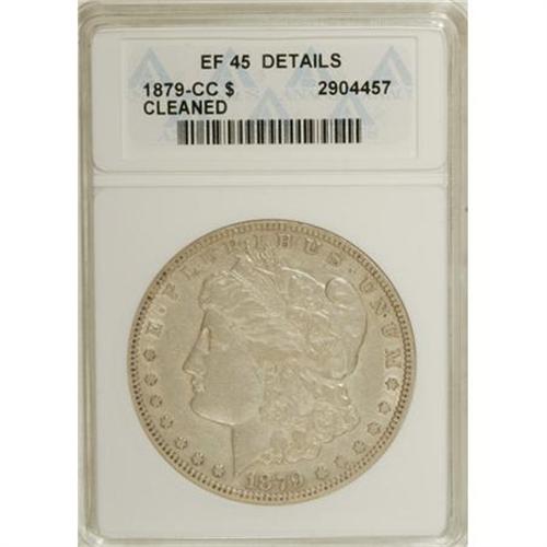 <B>1879-CC $1 --Cleaned--ANACS. XF45 Details.</B></I> NGC Census: (91/1019). PCGS Population (81/2099). Mintage: 756,000. Numismedia Wsl. Price for NGC/PCGS coin in XF45: $839. (#7086)<BR><BR><b>Shipping:</b> Coins & Currency (<a target="_blank" href="http://www.heritageauctions.com/common/shipping.php">view shipping information</a>)